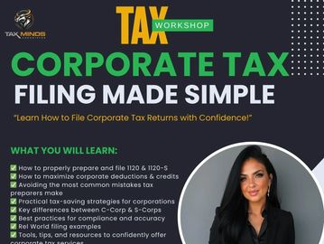 Take your tax career to the next level with our Corporate Tax Return Workshop, designed for tax professionals and entrepreneurs who want to confidently prepare and file corporate returns (Forms 1120 & 1120-S). Expand your clientele, boost your credibility, and create long-term revenue opportunities.